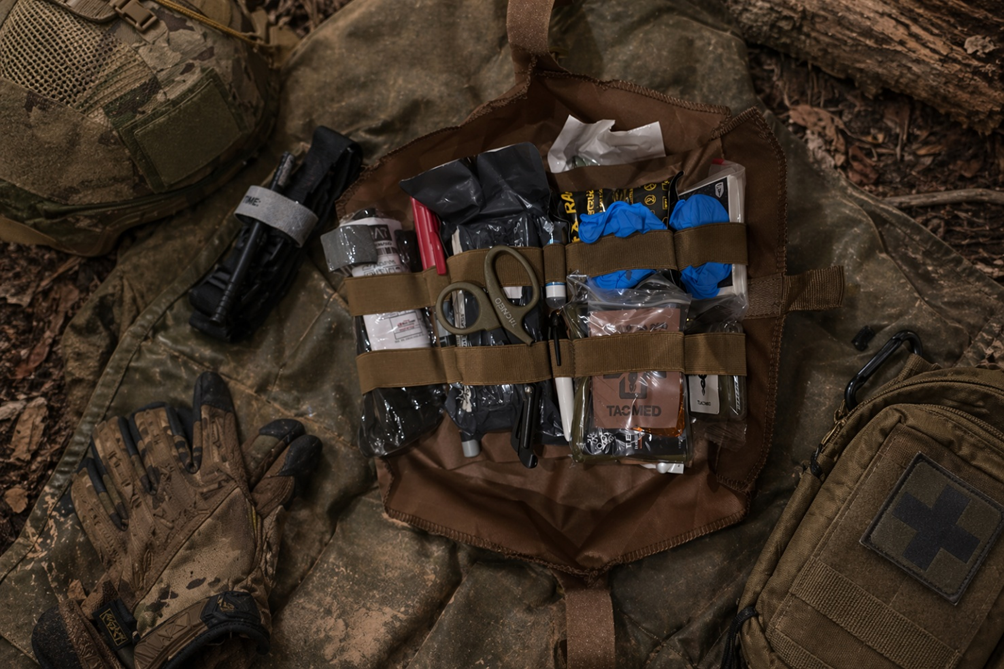 Базовий склад аптечки включає засоби контролю кровотечі (турнікет, гемостатик, бандаж), а також допоміжні елементи для стабілізації стану – рукавички, бинти, ножиці. Саме ці компоненти дозволяють діяти у перші хвилини після травми. У сучасних рішеннях, як у TacMed, акцент робиться саме на критичних засобах, а не на другорядних препаратах.